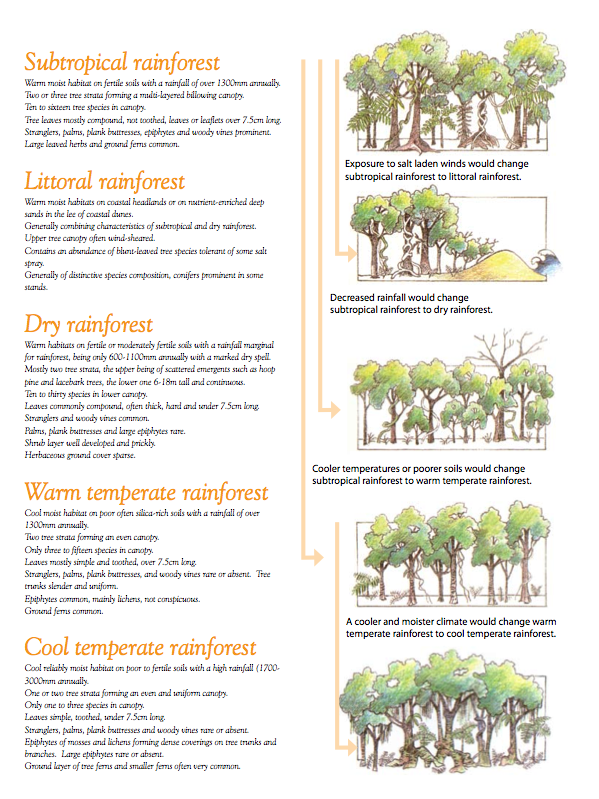 NSW National Parks and Wildlife Service put together a great booklet on the various rainforests throughout NSW called Under the Canopy. This page is from it and is the clearest description of various rainforest that I’ve found.